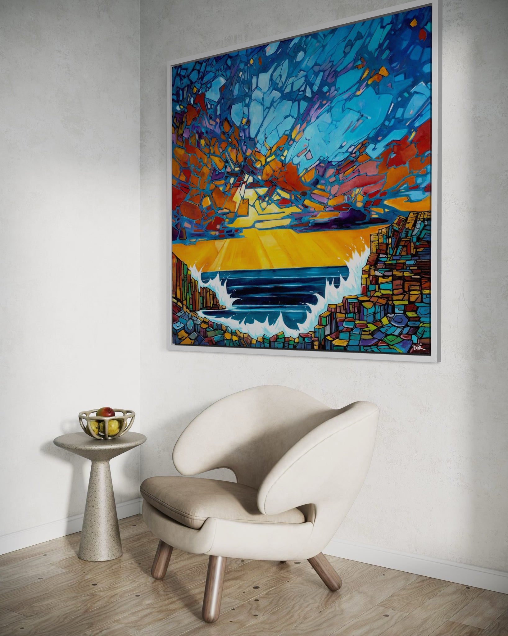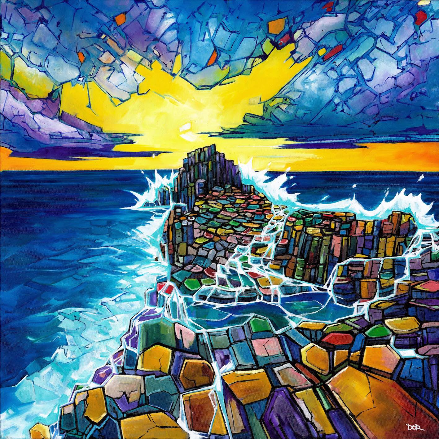 'Electric causeway is a vibrant, contemporary reimagining of the legendary Giants Causeway on Irelands North Coast. Bold, mosaicked shapes shatter into a kaleidoscope sky while radiant beams of gold spill across deep blue waters. The Iconic basalt columns rise like mythical architecture, guiding the viewers eye toward the explosive meeting of rock and wave. This oil painting captures the untamed rhythm of the Atlantic with an energy that feels alive, electric and fiercely optimistic, transforming one of the worlds most magical coastlines into a dynamic dreamscape of colour and light.